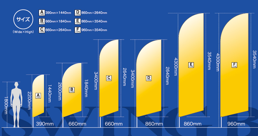スウィングバナーは、従来の幟に比べ視覚効果抜群で、各種イベント会場はじめ、カーディーラー様、カフェやレストランの店頭、レース場等の販売促進やPRに宣伝効果抜群です!またスウィングバナーは6種類のサイズがあり、屋内外を問わずインパクトのある目立った告知が得られます。小ロットから製作可能ですので展示会ブースの脇にも容易に設置が可能です。