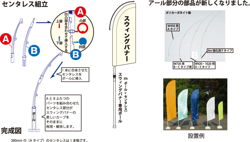 旗竿先端部分の素材はポリカーボネートです。丈夫な上に、柔軟性に優れていますので、屋外の厳しい条件の中でも、スウィングバナーを美しくなびかせ続けます。